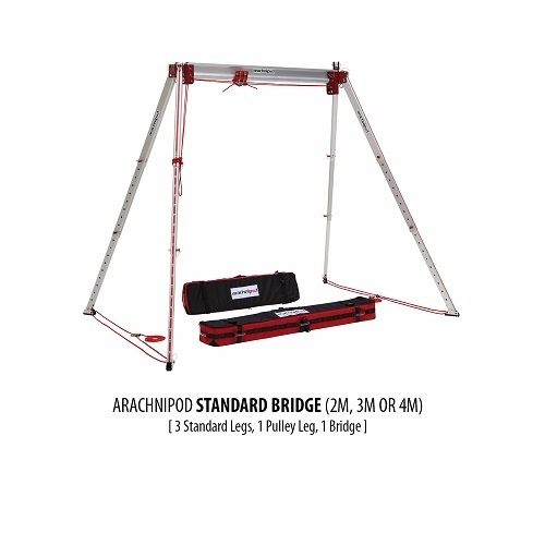 The Arachnipod Standard Bridge system comprises three Standard Legs and one Pulley Leg plus a 2m, 3m or 4m long Bridge beam. The system provides three load attachment points, four stabilisation rigging points, one double-grooved pulleys plus the versatility to configure additional technical systems.