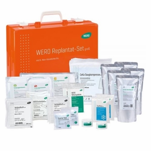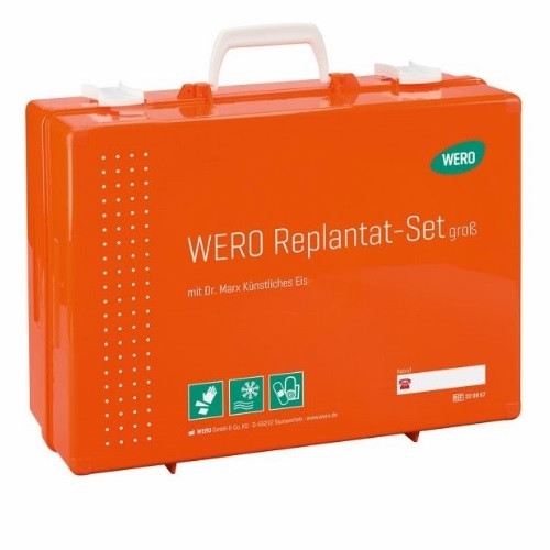 Replant rescue box for amputated body parts, designed for correct initial handling and safe preservation prior to hospital treatment. Proper use increases the likelihood that the amputated body part can be successfully replanted. The box is used by rescue services, ambulance personnel, and other medical professionals.