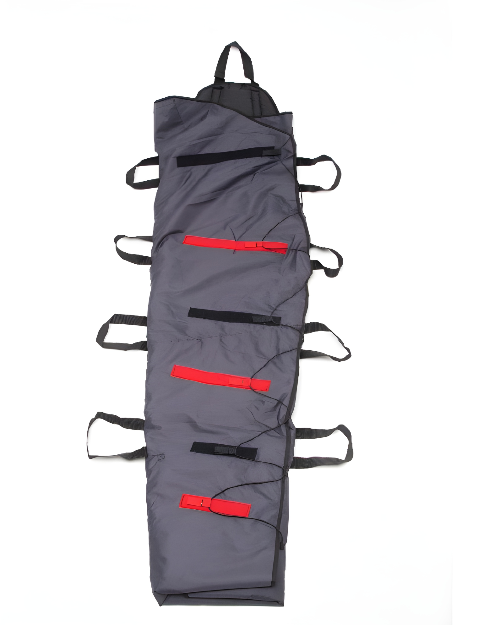 The burrito principle is used to wrap the patient, meaning the rescue bag is flexible and fits all body sizes. The bag, with the inserted moisture barrier, is rolled up to enable the "log-roll" method for moving the patient onto the rescue bag. Once the folding is completed around the patient, the rescue bag is secured using Velcro fasteners.