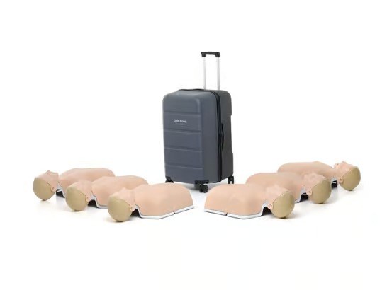 This set includes six light-colored Little Anne manikins, stacked together in a practical wheeled suitcase for easy transport and storage. The manikins are Bluetooth-enabled and connect seamlessly to the QCPR app, providing objective, real-time feedback to help improve CPR training quality and outcomes.
